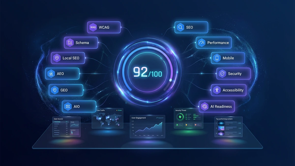 If you ran your website through our free website grader and you are reading this page, two things are probably true. First, you saw twelve category scores you may have never seen before — SEO, Performance, Mobile, Security, Accessibility, AI Readiness, AIO, GEO, AEO, Local SEO, Schema.org and WCAG. Second, you want to know exactly what each of those numbers means, why it matters for traffic and revenue, and what you should do about the ones that came back red.